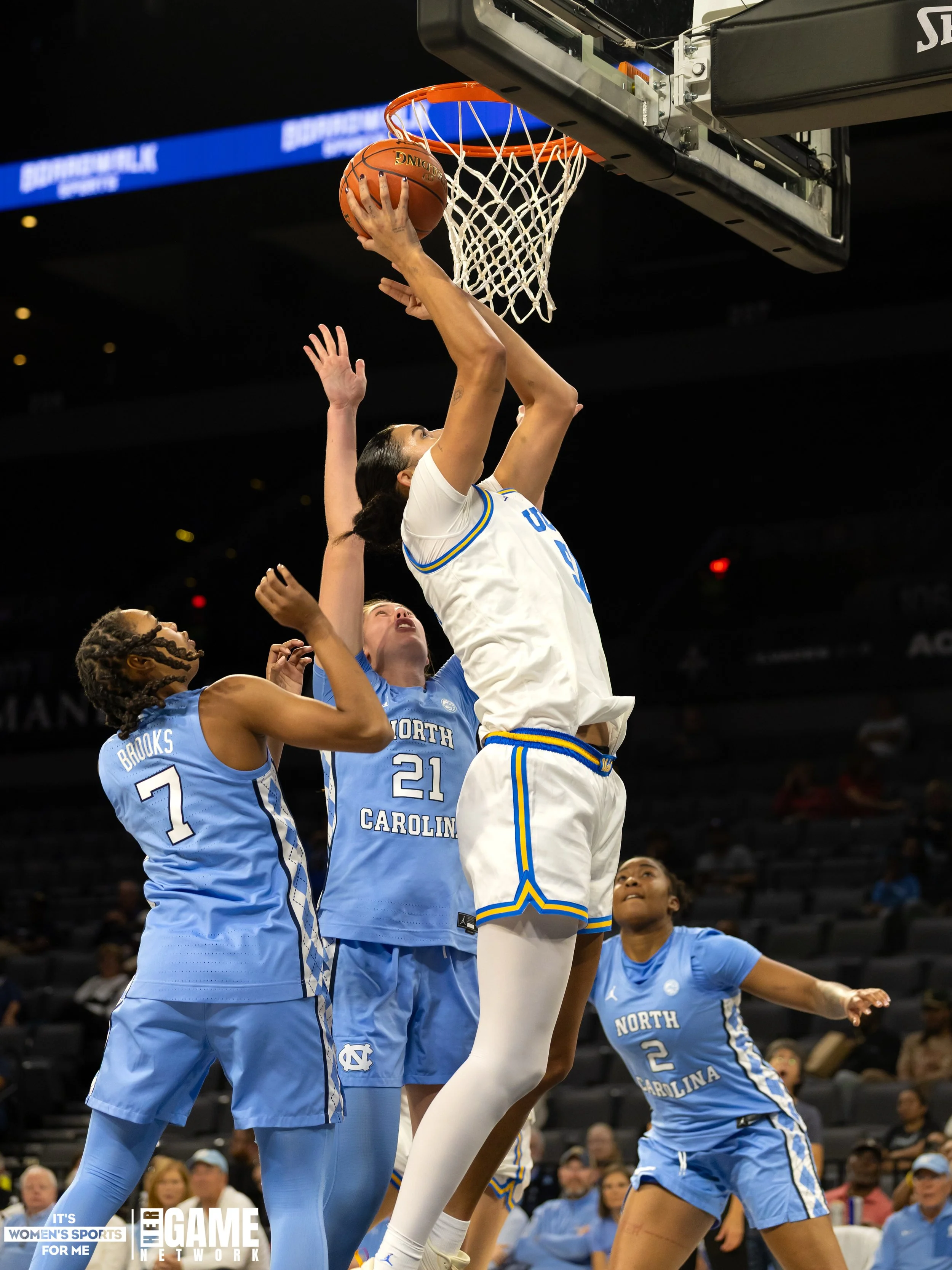 The nightcap featured a Top-15 showdown that ultimately belonged to the No. 3 UCLA Bruins (4-0), who overpowered the No. 11 North Carolina Tar Heels (2-1), 78-60. UNC’s defense held strong early, even leading 17-12 after the first quarter, but the Bruins’ superior size and talent proved too much in the end. UCLA exploded in the third, hitting nine consecutive field goals to pull away for good.